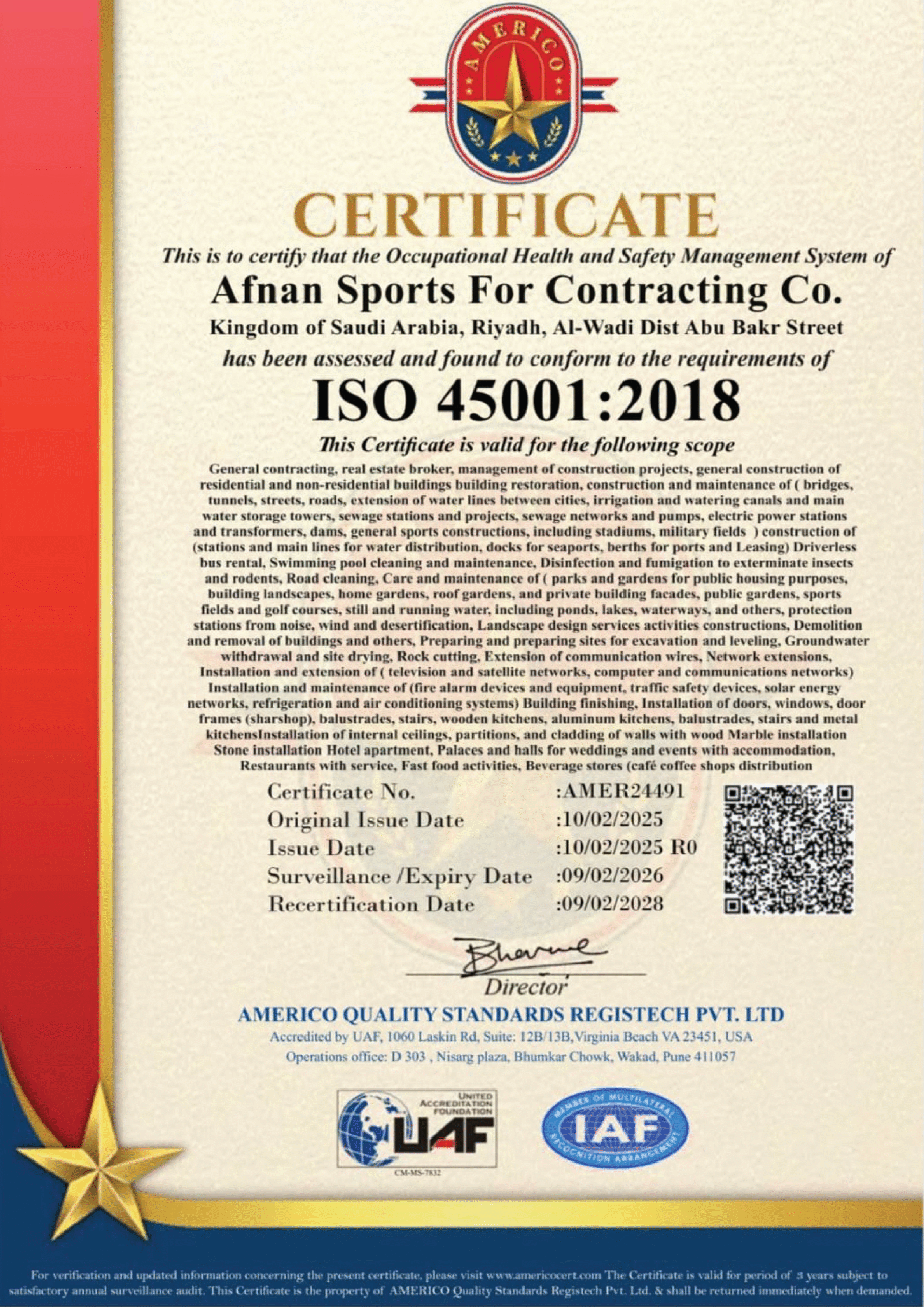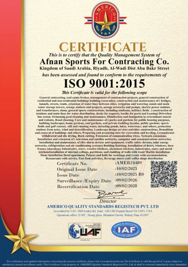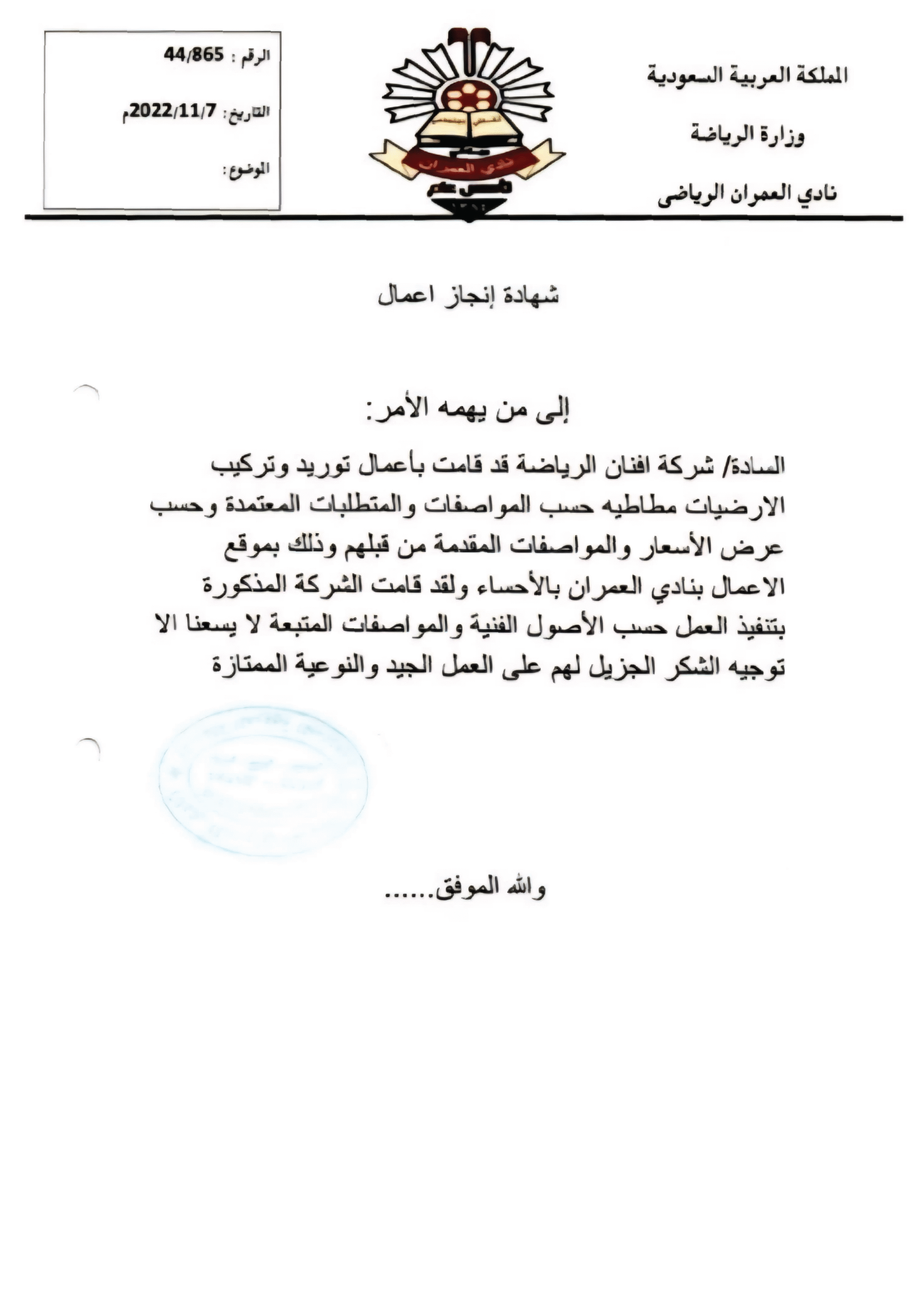 Afnan Sport Stadium Equipment Company is a dynamic organization established in 2021, and is distinguished by its specialization in supplying and installing everything related to the sports and entertainment field with the highest levels of quality.